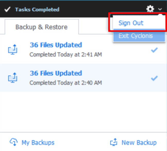 Taip pat galite atsijungti nuo savo „Cyclonis Backup“ paskyros per iššokantį „traybar“ langą. Sistemos dėkle spustelėkite „Cyclonis Backup“ piktogramą, kad atidarytumėte „traybar“ iššokantį langą. Tada spustelėkite krumpliaračio piktogramą ir meniu pasirinkite Atsijungti.