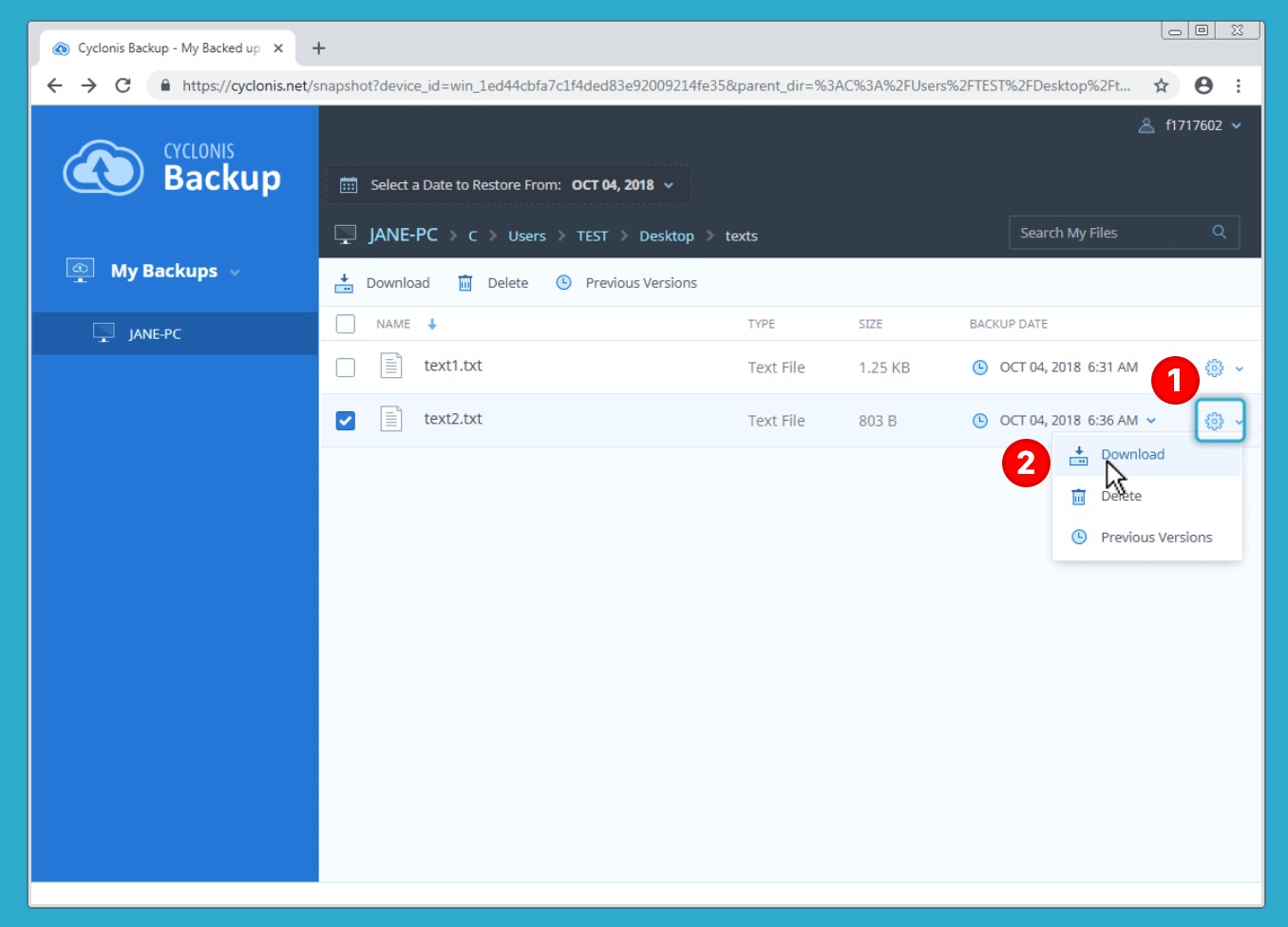 Você também pode usar um navegador da Web suportado para baixar e gerenciar os seus arquivos de backup no site do Backup do Cyclonis. O site do Backup do Cyclonis foi projetado para se adaptar à resolução da tela do seu dispositivo e funciona em uma grande variedade de computadores, telefones celulares, tablets e outros dispositivos. Para baixar arquivos através da interface da web do Backup do Cyclonis: