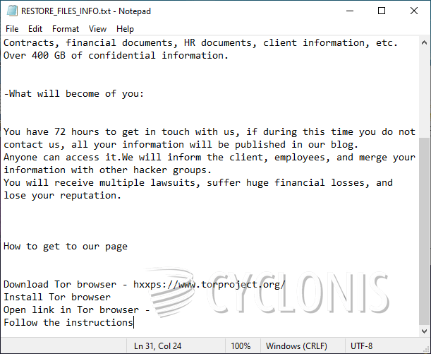 此恶意软件锁定的所有文件都标有扩展名“.newwave”。赎金还通过文件“RESTORE_FILES_INFO.txt”和“RESTORE_FILES_INFO.hta”投放了两张赎金票据。赎金通知告诉用户他们的数据已被盗,并且他们的副本已被永久加密。他们可以选择通过支付赎金来防止数据泄露并取回他们的文件。没有指定确切的金额,但 Midas Ransomware 的创建者可能要价数万美元或更多。他们建议受害者访问基于 TOR 的付款页面以获取更多详细信息。