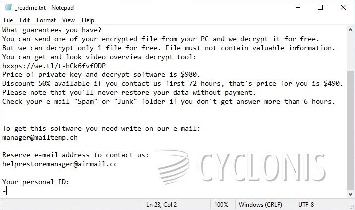 根据犯罪分子的消息,受害者可以通过购买解密器来解锁他们的文件。犯罪分子还提供免费解锁 1-2 个文件——只要受害者将它们发送到 manager@mailtemp.ch 或 helprestoremanager@airmail.cc。虽然您应该使用此优惠,但我们不建议您支付赎金。向勒索软件创建者汇款最有可能的结果是他们会欺骗您。相反,请使用防病毒扫描程序来消除 Mljx Ransomware。在此之后,研究在线提供的最佳数据恢复选项和软件。
