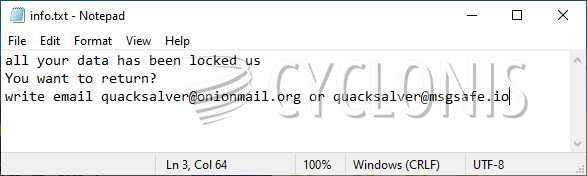 当然,Ver Ransomware 的受害者也会发现来自犯罪分子的勒索信息。此信息存储在威胁在完成文件加密任务后丢弃的文档“info.txt”中。